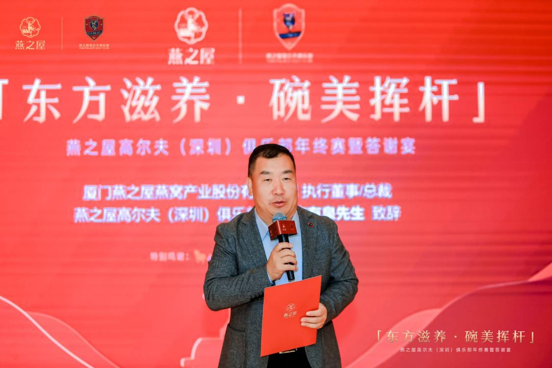 比賽結(jié)束后,所有嘉賓以及會員共聚答謝宴,品鑒佳肴、再續(xù)情誼。燕之屋執(zhí)行董事兼總裁、燕之屋高爾夫(深圳)俱樂部會長李有泉上臺發(fā)表致辭,并與眾領導嘉賓共同舉杯祝酒。燕之屋*26年專注高品質(zhì)燕窩(*燕之屋指燕之屋企業(yè)),堅持“源于天然,美與健康”的品牌理念,匠造健康、營養(yǎng)、美味、便捷的優(yōu)質(zhì)燕窩,贏得市場好口碑,于2023年在香港成功上市(股票代碼:01497.HK)。晚宴上,燕之屋旗下高端燕窩品牌“碗燕”產(chǎn)品碗燕·濃鮮款作為頭盤菜亮相餐桌,其營養(yǎng)優(yōu)質(zhì)、口感濃稠,博得一眾好評。碗燕·濃鮮款甄選東南亞高品質(zhì)金絲燕燕窩,燕窩原料100%正規(guī)進口,天然珍貴。采用121℃鮮萃工藝,密封燉煮,牢牢鎖住新鮮,產(chǎn)品0脂肪、0防腐劑、0增稠劑、0添加劑*(*指本產(chǎn)品生產(chǎn)過程中0%添加防腐劑山梨酸鉀、苯甲酸鈉,0%添加增稠劑瓊脂),是日常滋養(yǎng)的安心之選,也是高爾夫運動人士的“碗”美拍檔。