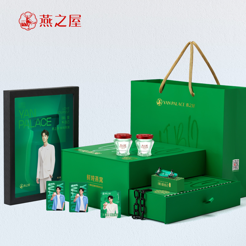 此外,王一博同款燕之屋鮮愛禮盒以青春張揚(yáng)的綠色為主色調(diào),充滿鮮活氣息;禮盒還附贈(zèng)“YIBO”“鮮”愛周邊禮包,包括發(fā)光海報(bào)、LED美妝鏡、燕窩專用挎包、指尖滑板、冰箱貼、果凍貼、大閃卡、卡片,不同規(guī)格享不同禮遇。驚喜與品質(zhì)兼具,王一博同款燕之屋鮮愛禮盒一經(jīng)上線,便掀起搶購(gòu)熱潮,贏得了廣大年輕消費(fèi)者的喜愛。