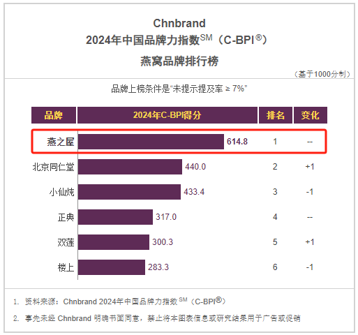 近日,2024年中國品牌力指數(shù)SM(C-BPI®)品牌排名和分析報告重磅發(fā)布,燕之屋以614.8分的優(yōu)異成績,榮登燕窩品牌排行榜榜首。至此,燕之屋已連續(xù)五年問鼎中國品牌力指數(shù)SM(C-BPI®)燕窩品類榜首。