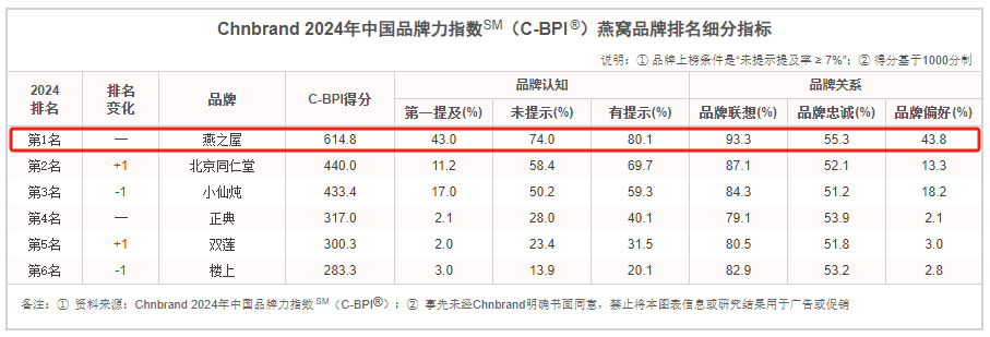 圖:燕之屋榮獲2024年中國品牌力指數(shù)燕窩品類排行榜榜首