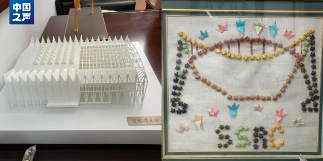 圖:沈世釗辦公室的吉林省滑冰館模型和手工禮物