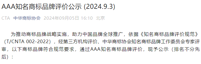 AAA知名商標(biāo)品牌,是根據(jù)《知名商標(biāo)品牌評(píng)價(jià)規(guī)范》T/CNTA 002-2022團(tuán)體標(biāo)準(zhǔn),經(jīng)第三方評(píng)價(jià)機(jī)構(gòu)現(xiàn)場(chǎng)評(píng)價(jià)、由中華商標(biāo)協(xié)會(huì)知名商標(biāo)品牌評(píng)價(jià)專家評(píng)審會(huì)審核批準(zhǔn)后,授予的榮譽(yù)稱號(hào)。這一標(biāo)準(zhǔn)由中華商標(biāo)協(xié)會(huì)聯(lián)合多家科研院所、專業(yè)協(xié)會(huì)、行業(yè)機(jī)構(gòu)和新聞媒體共同制定,旨在引導(dǎo)我國(guó)企業(yè)建立商標(biāo)品牌創(chuàng)造、運(yùn)用、管理和保護(hù)體系,積極推進(jìn)商標(biāo)品牌戰(zhàn)略實(shí)施,培育具有市場(chǎng)競(jìng)爭(zhēng)力、國(guó)際影響力的知名商標(biāo)品牌。燕之屋“碗燕”商標(biāo)榮獲AAA知名商標(biāo)品牌稱號(hào),是“碗燕”品牌贏得專業(yè)機(jī)構(gòu)認(rèn)可的充分證明,也見(jiàn)證了燕之屋“碗燕”作為中國(guó)品牌向前邁進(jìn)堅(jiān)實(shí)的一步。