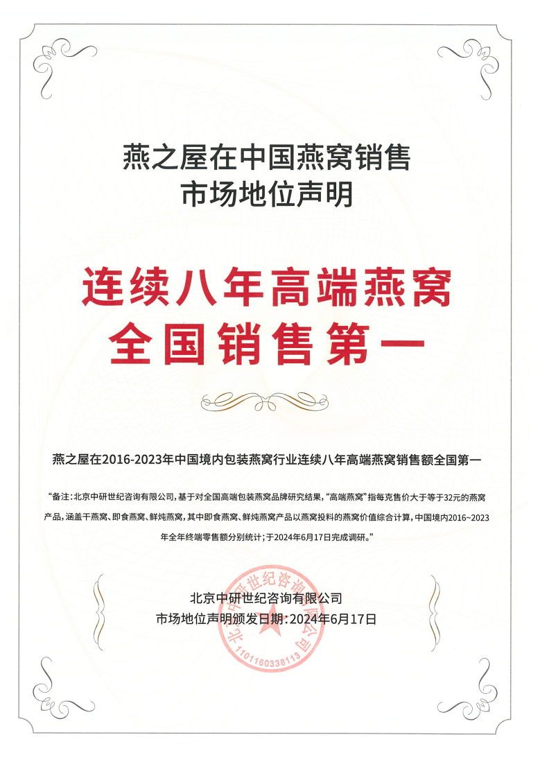 燕之屋26年專注高品質(zhì)燕窩,秉承“一碗好燕窩,滋潤天下人”的初衷,致力于為消費(fèi)者提供更健康、更營養(yǎng)、更美味、更便捷的燕窩滋養(yǎng),以卓越品質(zhì)塑造良好口碑。2019年,燕之屋正式入駐阿里健康大藥房,借助阿里健康平臺龐大用戶基礎(chǔ)及數(shù)字化能力,精準(zhǔn)定位消費(fèi)群體,拓寬營銷渠道,更好地滿足消費(fèi)者的多元滋養(yǎng)需求,深度鏈接健康產(chǎn)業(yè)市場。截至2023年,燕之屋已連續(xù)八年高端燕窩全國銷售第一*(*燕之屋在2016-2023年中國境內(nèi)包裝燕窩行業(yè)連續(xù)八年高端燕窩銷售額全國第一,備注:北京中研世紀(jì)咨詢有限公司,基于對全國高端包裝燕窩品牌研究結(jié)果,“高端燕窩”指每克售價大于32元的燕窩產(chǎn)品,涵蓋干燕窩、即食燕窩、鮮燉燕窩,其中即食燕窩、鮮燉燕窩產(chǎn)品以燕窩投料的燕窩價值綜合計算,中國境內(nèi)2016-2023年全年終端零售額分別統(tǒng)計;于2024年6月17日完成調(diào)研),并于港交所成功上市(股票代碼:01497.HK),其不僅是燕窩行業(yè)“領(lǐng)頭燕”,也是健康產(chǎn)業(yè)的一匹黑馬,奮勇前進(jìn),勢不可擋,展現(xiàn)蓬勃力量。