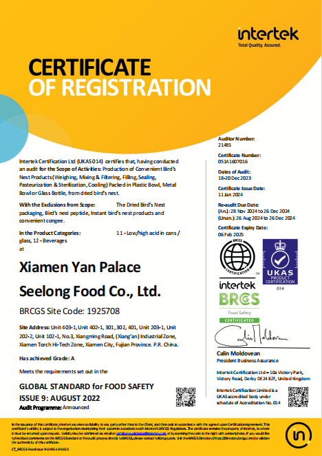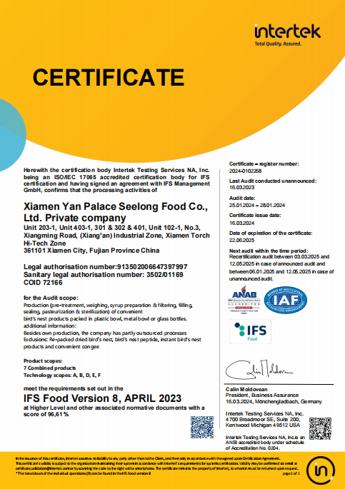 為了響應(yīng)美國(guó)官方的高標(biāo)準(zhǔn)要求,燕之屋分別通過(guò)了HACCP食品管理體系認(rèn)證、BRC全球食品安全標(biāo)準(zhǔn)認(rèn)證、IFS國(guó)際卓越標(biāo)準(zhǔn)認(rèn)證和食品出口備案資質(zhì),參加了美國(guó)FDA指定的由中國(guó)檢驗(yàn)檢疫科學(xué)院舉辦的BSPC培訓(xùn),并順利通過(guò)考核獲得出口資格,通過(guò)了FDA、FCE、SID注冊(cè)。此外,燕之屋更主動(dòng)將產(chǎn)品送至權(quán)威檢測(cè)機(jī)構(gòu)SGS,152項(xiàng)指標(biāo)檢測(cè)全部合格通過(guò),印證燕之屋卓越產(chǎn)品力。2024年10月25日,燕之屋在廈門(mén)海關(guān)系統(tǒng)報(bào)檢通關(guān)。之后,燕之屋旗下高品質(zhì)燕窩產(chǎn)品冰糖官燕(60gx6、60gx12)、碗燕·禧孕款(80gx3)、碗燕·尊享款(158gx6)、碗燕·甄愛(ài)款(108gx6)、碗燕·濃鮮款(138gx10)通過(guò)美國(guó)食品藥品管理局(FDA)審批,順利運(yùn)抵紐約,正式上架開(kāi)售,為當(dāng)?shù)叵M(fèi)者帶來(lái)來(lái)自中國(guó)的高端尊貴滋養(yǎng)。